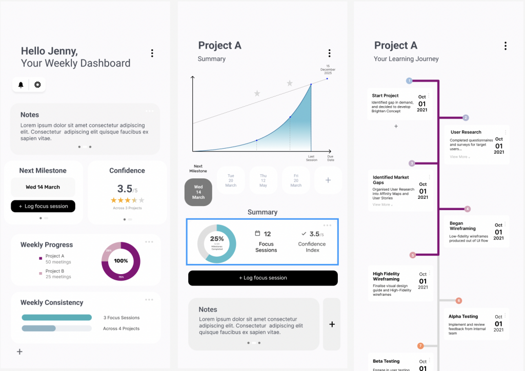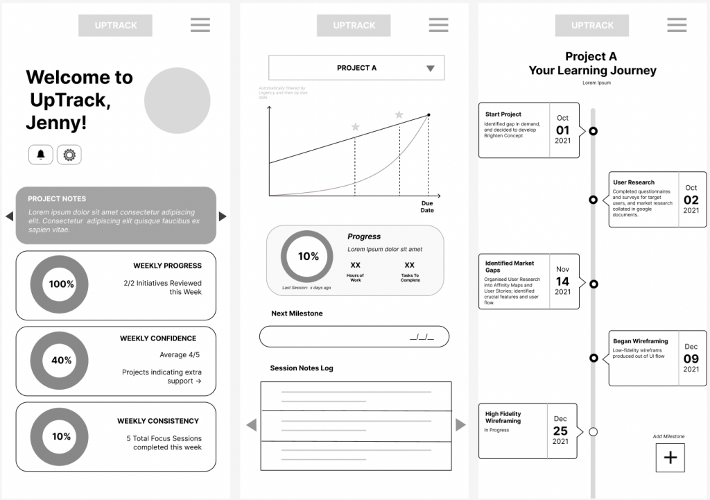 - Low Fidelity Wireframe sketches explored layouts for dashboards, task lists, and progress tracking.